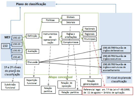 Mapa conceptual - Na primeira partição considerou-se que para a “Definição e avaliação de políticas” a Administração necessita de desenvolver atividades de Definição, Avaliação e Discussão. Estabeleceu-se uma relação funcional.