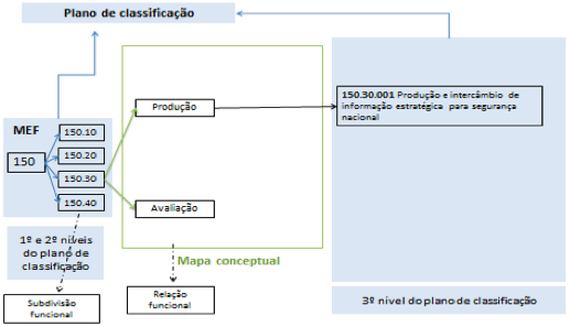 Mapa conceptual - Para a partição considerou-se as atividades inerentes à subfunção: “Produção de informação estratégica e de segurança”. Estabeleceu-se uma relação funcional com as seguintes subdivisões: “Produção” e “Avaliação”.