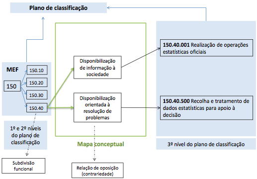 Mapa conceptual - Na partição adotada considerou-se o exposto na Lei n.o 22/2008, de 13 de maio, que determina a existência de “...informação estatística produzida no âmbito da execução do programa da atividade estatística do SEN (Sistema Estatístico Nacional) e das organizações internacionais das quais Portugal é membro...”. Deste dispositivo resulta a existência de estatísticas oficiais que visam a “Disponibilização de informação à sociedade” em geral. Considerou-se, por outro lado, a existência de estatísticas que visam a “Disponibilização de informação orientada à resolução de problemas” através da recolha de dados para apoiar e sustentar a tomada de decisão. Estabeleceu-se uma relação de oposição.