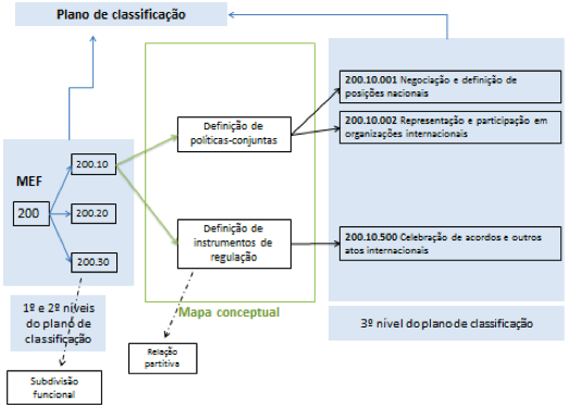 Mapa conceptual - Na partição considerou-se as atividades inerentes à subfunção, nomeadamente a “Definição de políticas conjuntas” (relativa à participação do Estado português em atividades de negociação de políticas e estratégias internacionais) e a “Definição de instrumentos de regulação” (relativa à participação na negociação, preparação e fixação de instrumentos reguladores das relações internacionais). Estabeleceu-se uma relação partitiva.