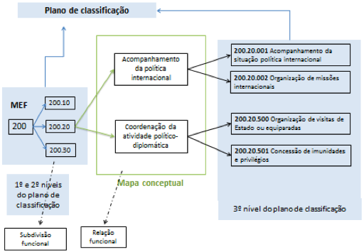 Mapa conceptual - Na partição considerou-se as atividades inerentes à subfunção. O primeiro ramo corresponde ao “Acompanhamento da política internacional”, enquadrando-se, no segundo, a “Coordenação da atividade político-diplomática”. Estabeleceu-se uma relação funcional.
