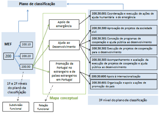 Mapa conceptual - Na partição considerou-se a natureza dos projetos inerentes à execução da política externa. Nesse sentido, o primeiro ramo incide sobre o “Apoio de emergência”, o segundo sobre a “Ajuda ao desenvolvimento” e o terceiro sobre a “Promoção de Portugal no Estrangeiro e de países estrangeiros em Portugal”. Estabeleceu-se uma relação funcional.