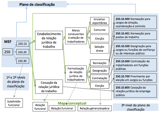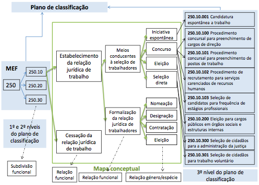 Mapa conceptual - Na primeira partição considerou-se as atividades inerentes à subfunção: subdividindo-se em dois ramos, sendo o primeiro relativo ao “Estabelecimento de relação jurídica de trabalho” e o segundo à “Cessação da relação jurídica de trabalho”. Estabeleceu-se uma relação funcional.