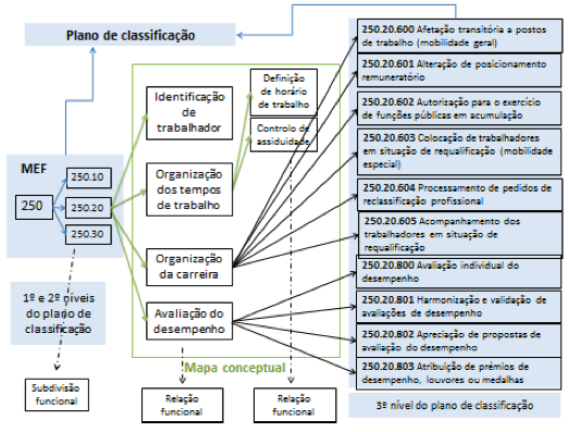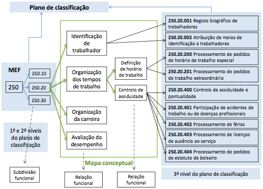 Mapa conceptual - Se a subfunção 250.10 integra o início e o fim da relação laboral, a subfunção 250.20 integra todas as atividades da relação laboral já estabelecida com cada trabalhador: a “Identificação do trabalhador”, a “Organização dos tempos de trabalho”, a “Organização da carreira” e a “Avaliação do desempenho”. Estabeleceu-se uma relação funcional.