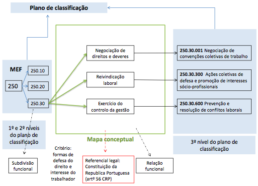 Mapa conceptual - Utilizou-se como referencial para a partição desta subfunção o Art. 56.o da Constituição da República Portuguesa, que consagra “os direitos das associações sindicais e contratação coletiva”, que aponta para a três formas de defesa dos direitos e interesses dos trabalhadores: a “Negociação de direitos e deveres”, a “Reivindicação laboral” e o “Exercício do controlo de gestão”. Estabeleceu-se uma relação funcional