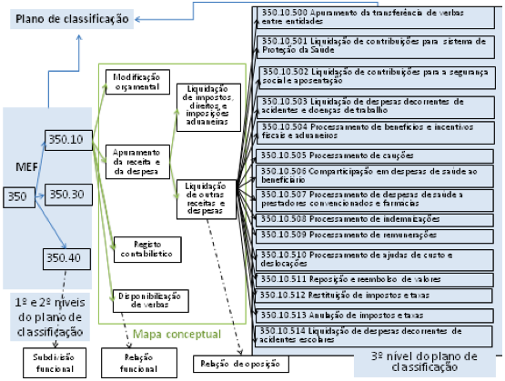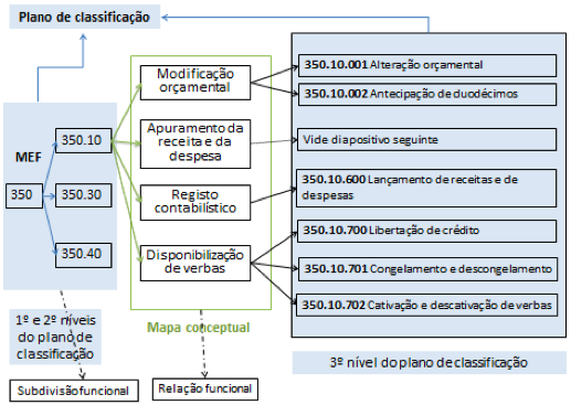 Mapa conceptual - Na primeira partição considerou-se as atividades inerentes à subfunção. Constituindo-se os seguintes ramos: “Modificação orçamental”, ‘”Apuramento da receita e da despesa”, “Registo contabilístico” e “Disponibilização de verbas”. Estabeleceu-se uma relação funcional. A partição teve como referencial a legislação, designadamente o Decreto-lei n.o 26/2002, de 14 de fevereiro, que aprova os códigos de classificação económica das receitas e das despesas públicas, bem como a estrutura da classificação orgânica aplicável aos orçamentos e contas dos organismos que integram a Administração Central, o Decreto-lei n.o 36/2013, de 11 de março, que estabelece as disposições necessárias à execução do Orçamento do Estado para 2013, aprovado pela Lei n.o 66 -B/2012, de 31 de dezembro e ainda a Lei de Enquadramento Orçamental, isto é a Lei n.o 91/2001, de 20 de agosto, alterada pela Lei n.o 52/2011, de 13 de outubro.