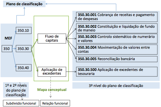 Mapa conceptual - Na partição considerou-se as atividades inerentes à subfunção, em que se compreende os fluxos financeiros movimentados (pagamentos, cobranças, transferências, depósitos, entre outros) e a rentabilização dos excedentes de tesouraria. Consequentemente, constituíram-se os seguintes ramos “Fluxo de capitais” e “Aplicação de excedentes”. Estabeleceu-se uma relação funcional.