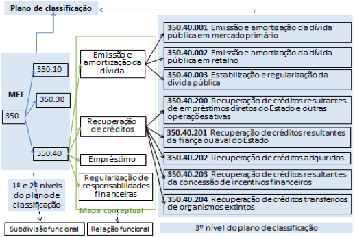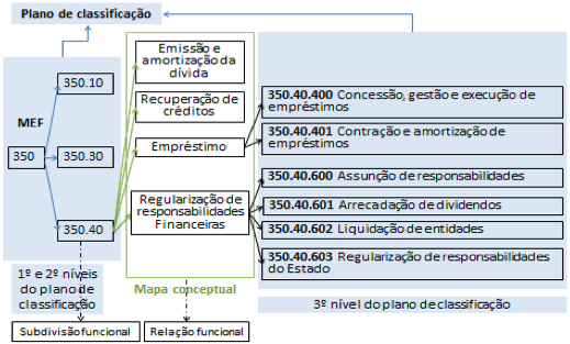 Mapa conceptual - Na partição considerou-se as atividades inerentes à subfunção, constituindo-se os seguintes ramos “Emissão e amortização da dívida”, “Recuperação de créditos”, “Empréstimo” e “Regularização de responsabilidades financeiras”. Estabeleceu-se uma relação funcional.