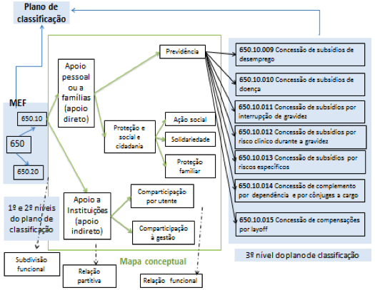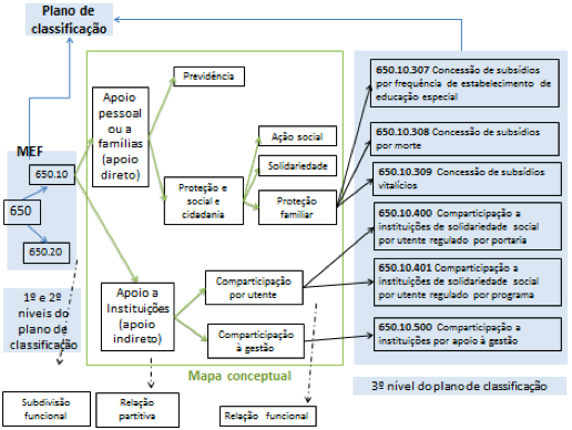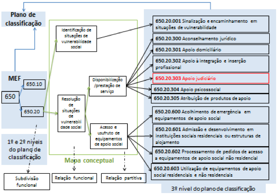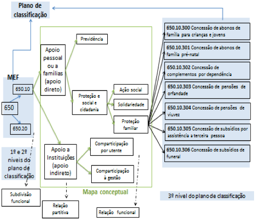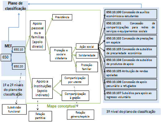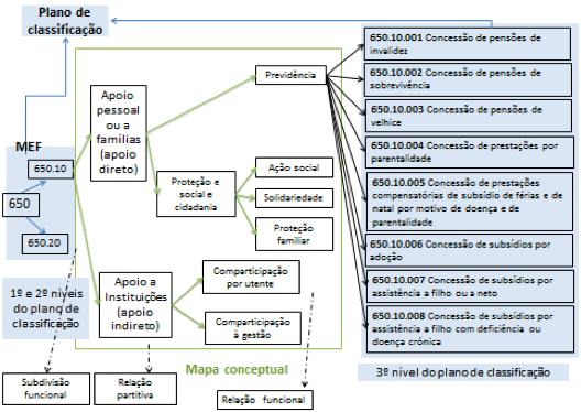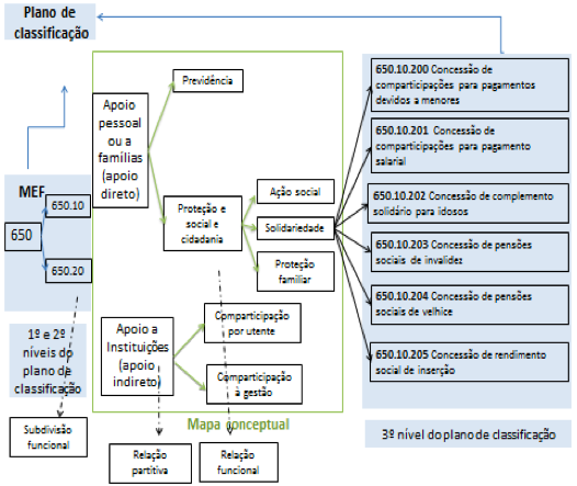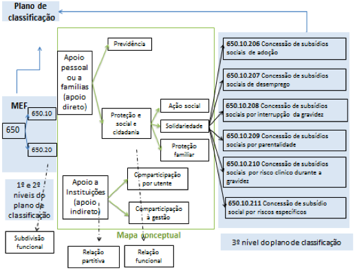 Para o desenvolvimento do mapa conceptual da classe 650.10 foram considerados os seguintes referenciais legais: o Artigo 63o da Constituição da República Portuguesa e a Lei de bases da Segurança Social, a Lei n.o 4/2007, de 16 de janeiro. A partir destes diplomas identificaram-se os sistemas e subsistemas de proteção e inclusão social que, em última instância, enquadram e regulamentam a atribuição de prestações sociais e auxílios económicos.